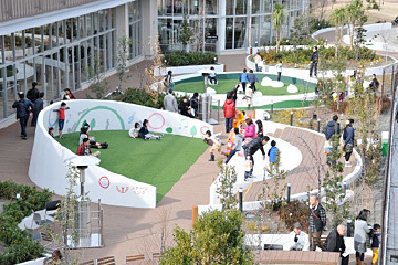 この「スカイパーク」には芝生の広場や水遊びができる噴水やビーチがあります。傾斜がある芝生があるのですが、上り下りをして遊ぶ子ども達がたくさん楽しんでいます。