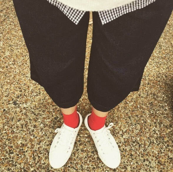 例えば、赤いソックスをワンポイントにした写真のコーデは、ガウチョとスニーカーの間で足首を見せたおしゃれ上級者コーデ。