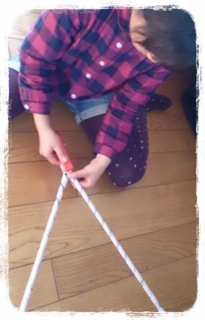 このとき、三角形の頂点から頂点へと、逆三角を作るように横棒を繋ぎ合わせます。しっかり持っていないと倒れちゃうので、子どもにしっかり支えてもらいましょう!