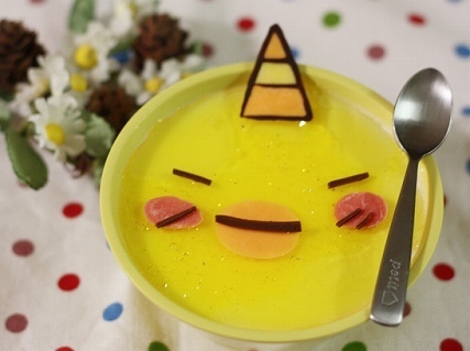今回は、ミルクゼリーに黄色のジェルペンでキスケの色を作りましたが、かぼちゃプリンやマンゴーゼリーなど、黄色いスイーツであれば何でも大丈夫です。