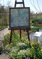 モネの「睡蓮」を模した睡蓮の花が楽しめる池のある庭に、モネの「睡蓮」の絵画が飾ってあります。