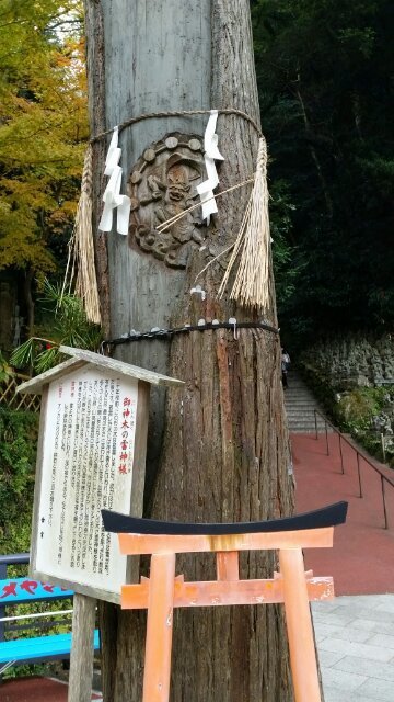 木にどうして鳥居が?と思って上を見上げたら、木に彫られた風神雷神。こちらは不動明王のすぐ側にあります。