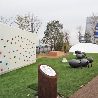 また、巨大ありの置物は、小さい子が乗って楽しめます。ボルダリングの壁もあり、無料ゾーンとはいえ公園のようにしても遊べます。