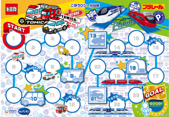 シールを貼る部分が10ヶ所と少なめに設計されています。他のシール台紙よりも早く全てのマスを埋めることができるので、ごほうびシートデビューにぴったりです。