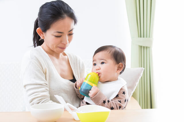 ストローを使って吸い込む練習が必要ですが、親が息を吸う様子を見せたりすることで徐々にできるようになりますよ。はじめはこぼしてしまうことが多いですが、だんだんと上手になります。