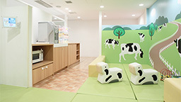 このほか、ソファと手洗い場のある半個室の授乳エリア、おむつ交換台のあるトイレも備えられているので、安心して小さい子どもと一緒に過ごせますね。待ち時間に退屈しないように乳幼児向けの本やおもちゃもありますよ。