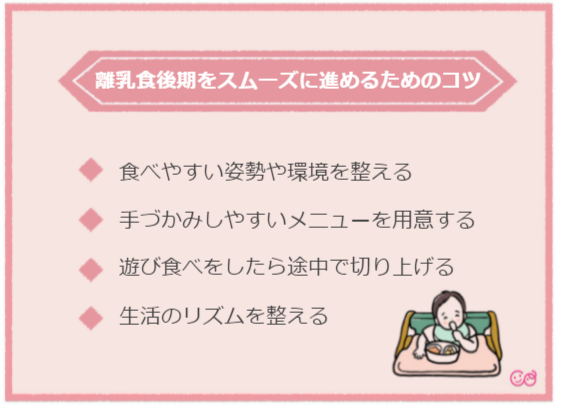 離乳食後期は、赤ちゃん自ら手を出して食べようとする時期です。食べる意欲を育てるために、赤ちゃん自身が食べやすい食事の環境を整えてあげましょう。