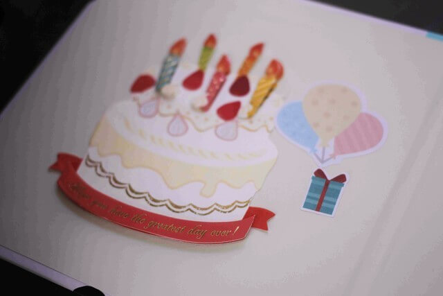 右側には写真を貼って、左側にはシールを貼れば、記念日の色紙ができあがり!真ん中にケーキを貼って、いちご、ホイップクリームや風船の小さいシールも、自由にレイアウトして貼ることができます。