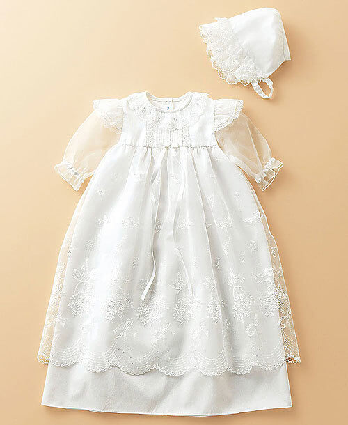 ベビードレスは、シンプルで便利なツーウェイオール。アフガンは刺しゅう入りオーガンジーなので、フォーマルな場にぴったりです。また靴下は紐結び式なので、脱げにくいところも便利です。