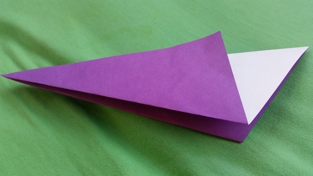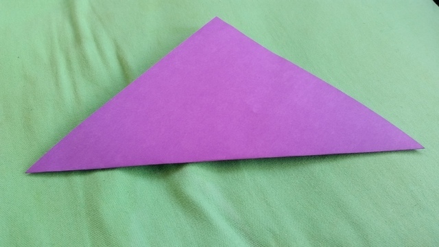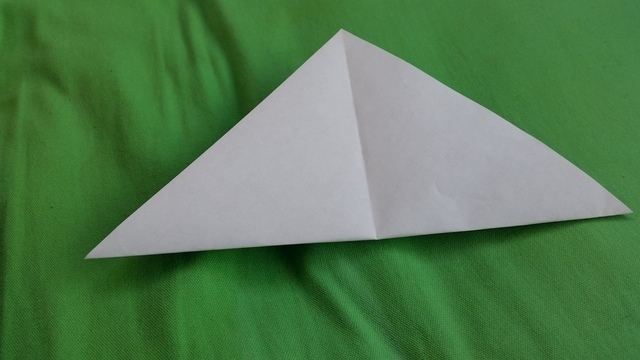 尖った頂点を合わせるように、向う側に半分に折りましょう。
