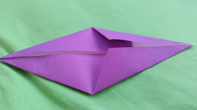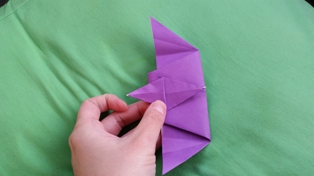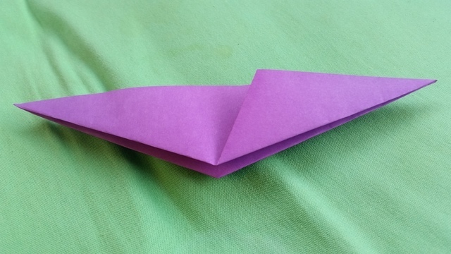 下の角を両側とも上向きに折りましょう。上向きに折った部分がプテラノドンの翼になります。