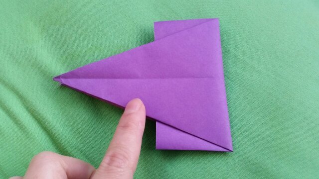 尖がった左側の部分を半分に折りましょう。