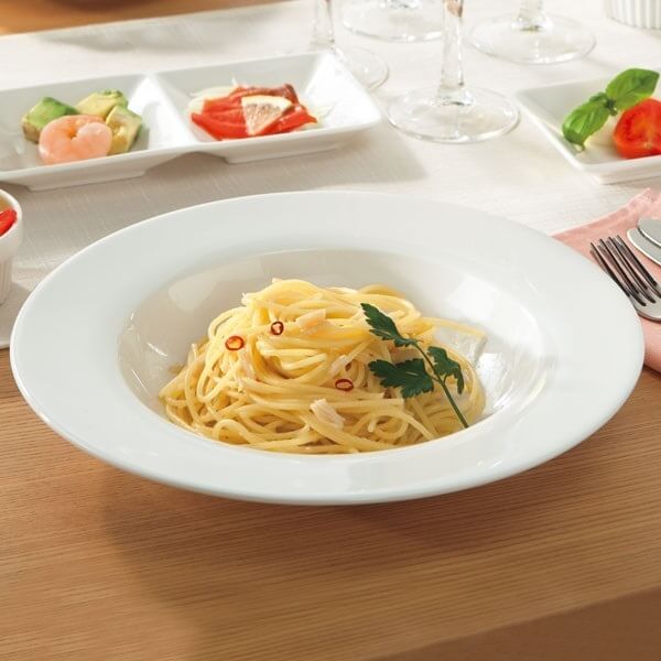 帽子を裏返したような、真ん中部分がくぼんだ独特の形のお皿は、深さもあるのでスープパスタなど水分が多いメイン料理も盛りつけることができます。
