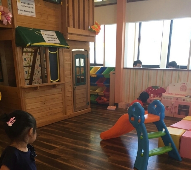 大型遊具やおままごとセット、色んなおもちゃがあり、男の子も女の子も楽しめ、このキッズルームを囲むように席が配置されてるので、ここなら食事をしながら遊ぶ子どもを見ることができ、ゆっくり食事を楽しめます。