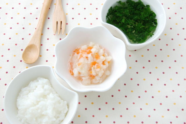 おかゆは7倍がゆになり、野菜の形状はペースト状からみじん切りにして形のあるものを食べさせていきましょう。1回の食事で7倍がゆなどの穀類、野菜、肉や魚をバランスよく与えていきたいですね。