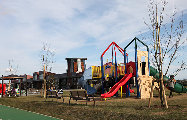 遊具の脇は、子どもだけでなくパパやママ、おじいちゃんやおばあちゃんとも一緒に訪れて、まったりと過ごせる広大な芝生広場になっています。ベンチや東屋もありますので、家族みんなでのピクニックにも最適ですよ。