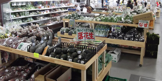 里の恵みである野菜や果物はもちろん、子どもが大好きなハムやソーセージなどに人気があります。また魚や海老、ハマグリといった海の幸から、丹精こめて造られたお惣菜まで、毎日たくさん取り揃えられています。工芸品や地元素材を使った出来立てパンもお土産にぴったりですよ。