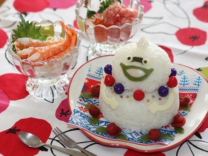 土台と顔のおにぎりの境には、ブルーベリーピックやイチゴのピックを乗せましたが、無くても良いですし、あればいくらやサーモンなど切って彩りに乗せても。