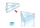 (3)上にビーズや小さく切った色紙などを入れ、カードケースを一辺が7.1cmの正三角形に切り取ったフタをかぶせセロテープで固定します。この時フタはまだ完全には閉めず、一度仮どめして反対側から覗いてみます。そこで、ビーズなどの量を調整して、よければ固定します。