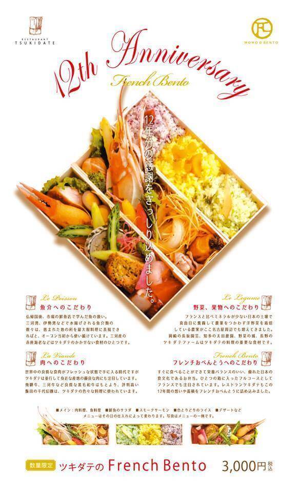 出典:tsukidate.info本格フレンチをゆっくり楽しみたいけれど、赤ちゃん連れでフレンチはやっぱり緊張する…という方には、テイクアウトのお弁当がおすすめ!オープン12周年を記念して作られた3,000円の「フレンチ弁当」は、肉や魚、野菜などすべての食材にこだわっており、ひとつの箱に入ったフルコースとして注目を浴びています。