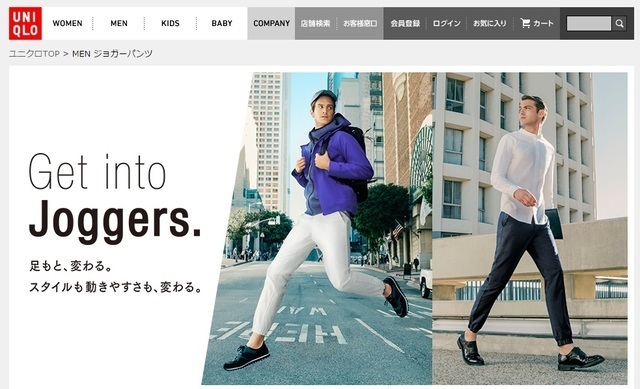 出典:www.uniqlo.comこの春の注目アイテム、ジョガーパンツはメンズにも登場。足首が細くなっているので公園で子どもと遊んでも、裾が汚れず、かつ、もたつきません。また、ウエストは楽に履けます。