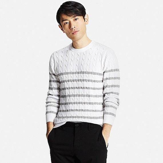 出典:www.uniqlo.com【2】の模様違いがこちら。胸元から下にかけてボーダーのラインが入っています。ケーブル編+ボーダーで高級感も感じさせます。細いケーブル編なので、きちんと感もあります。