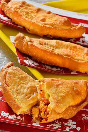 揚げてあるのでさくさくしていてピザという感じがあまりありませんが、中のジューシーなお肉と旨くマッチしていますよ!