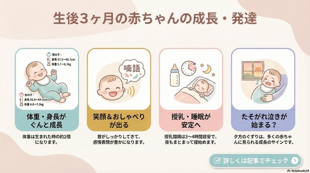 厚生労働省の発育調査によると、生後3ヶ月の男の子の身長は57.5~66.1cmで体重が5.1~8.1kg、頭囲の平均41.3cm、胸囲の平均が41.8cmです。女の子の身長は56.0~64.5cmで体重が4.8~7.5kg、頭囲の平均が40.2cm、胸囲の平均が40.5cmになります。