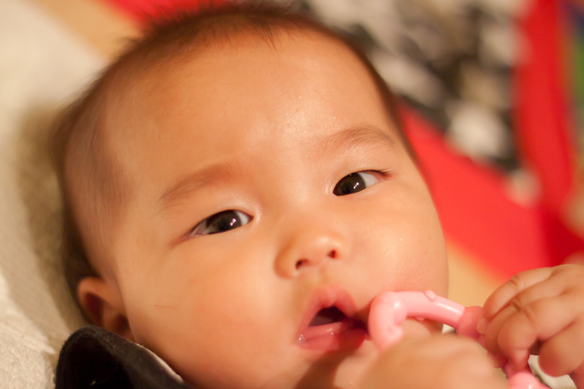 赤ちゃんが自分の手やこぶしをじっと見つめる「ハンドリガード」や、指しゃぶりが盛んになってきてかわいさが増します。手の動きも活発になり、おもちゃを手で掴もうとしますので、手の届く範囲にガラガラなどをぶら下げるのもよいですね。
