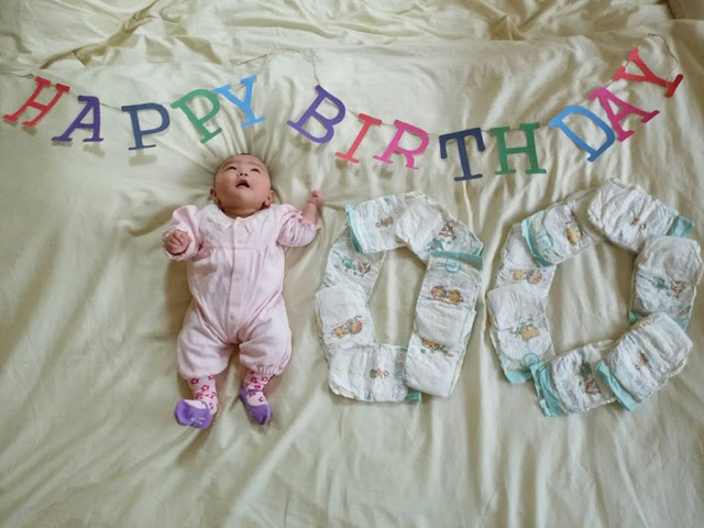 SNSでは赤ちゃんを数字の「1」に見立てて、おむつを使って「0」の形を作り「100」の文字にしてから記念撮影するのが流行っていますね。赤ちゃんとおむつだけ用意すればいいので、挑戦してみてはいかがでしょうか?