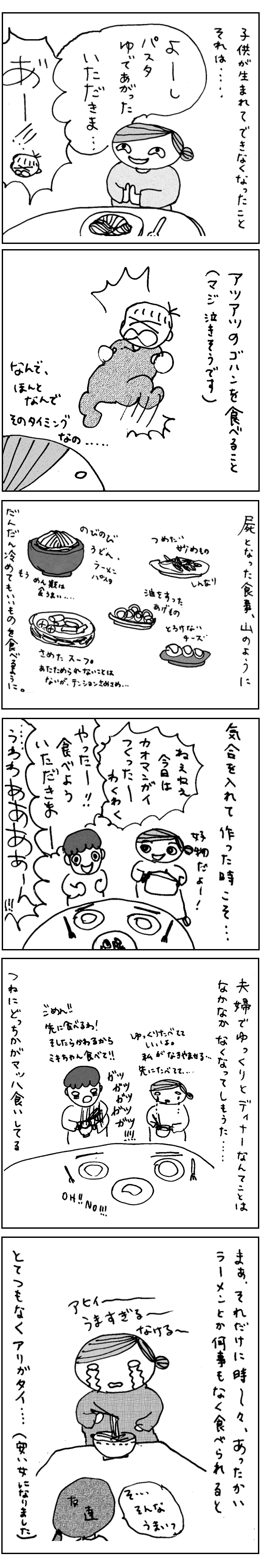 (23)温かいごはんが、食べたいどうして子どもっていうのは、「ここぞ!」っていう時に泣いたりしちゃうんですかね。のびのびのパスタを食べる時は、なかなか、わびしいものがありますな。この記事に関連するリンクはこちらfacebookのにこたまコミュニティです。ぜひご参加ください。にこたまの公式HPですまとめ食事カオスでなくなるのは、3歳くらいかなぁ・・・【育児マンガ】はたらく母さんの日々。『にこたま』|(20)たそがれこわい【育児マンガ】はたらく母さんの日々。『にこたま』バックナンバー ・掲載内容や連絡先等は、現在と異なる場合があります。・表示価格は、改正前の消費税率で掲載されている場合があります。ご了承ください。 関連記事 【育児マンガ】はたらく母さんの日々。『にこたま』|(11)TV禁止 みっきーあらなわ 【育児マンガ】はたらく母さんの日々。『にこたま』|(19)背中センサー みっきーあらなわ 【育児マンガ】はたらく母さんの日々。『にこたま』|(5)哺乳瓶ジェラシー みっきーあらなわ 関連するキーワード ゆっくり お食事 パパ 泣く はたらく母さんの日々。『にこたま』 料理 あるある
