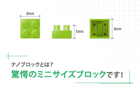 一般的なブロックおもちゃと違う点は、ブロック1個あたりが「ナノサイズ(小さいサイズ)」だということ。ホームページには、最小サイズは4ミリ×4ミリと書かれていて、”世界最小級ブロック”との文字が。