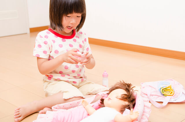 3歳を過ぎると言葉もずいぶん発達して、お人形に話しかけ、ごはんを食べさせたり、寝かしつけたり、お着替えさせたりなど、お友達や赤ちゃんに見立てて遊んだりします。