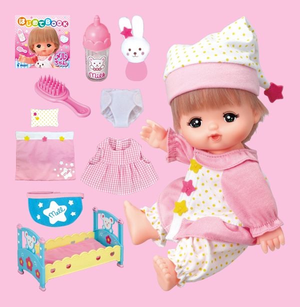 *セット内容:メルちゃん本体(パンツ付き)、ベビーふく、ナイトキャップ、くまさんベッド、かけぶとん、スタイ、ガラガラ、シャツ、まくら、おむつ、ミルクびん、ブラシ、ミニブック