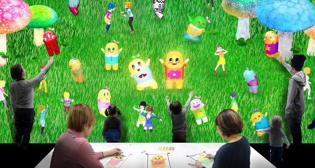 今回はチームラボアイランドの中から、「お絵かきふなっしー」、「お絵かき水族館」、「光のボールでオーケストラ」、「小人が住まうテーブル」、「天才ケンケンパ」の5作品が展示されます。