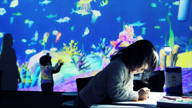 出典:http://island.team-lab.com「 お絵かき水族館」でも、自分で描いたお魚や海の生きものが巨大な水槽を泳ぎ回る体験が出来ます。画面には触れることもできて、触れると驚きの動きが見れますよ!行ってからのお楽しみです!