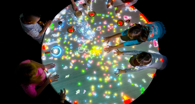 出典:http://island.team-lab.com大きなテーブルの周りを、小人たちが走り回っています。テーブルの上に小人の映像を投影しているのねと思いきや…子どもがテーブルの上に手を置くと……走っていた小人たちがその手に合わせて進路を変える!お皿などの物を置くと、お皿の上にリンゴが出てきたり、フライパンを置けば炎がメラメラと燃え上がる!