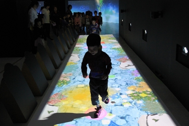 出典:http://island.team-lab.com「 天才ケンケンパ」というアトラクションでも、足元に映る映像に合わせてケンケンパしていくと、子どものケンケンパの動きに合わせて足元の色や模様がどんどん変化していく、不思議な体験が楽しめます。