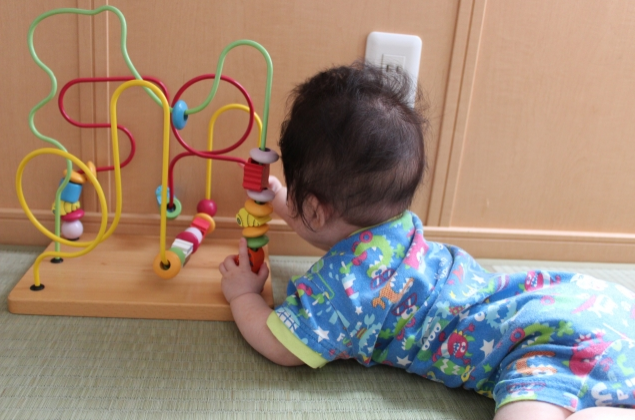 ・ビーズコースターは、電車に見立てて遊んでおり、他のおもちゃも月齢に合った遊びをしています。