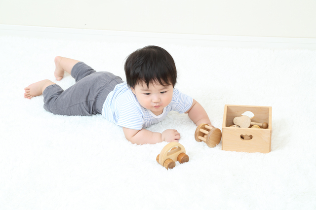 生後6ヶ月になると、今まではぐらついていたおすわりが安定的になって上手になります。同時に手先の動きも器用になってくるので、おすわりしながら目の前にあるおもちゃを触って遊ぶという事もできるようになります。