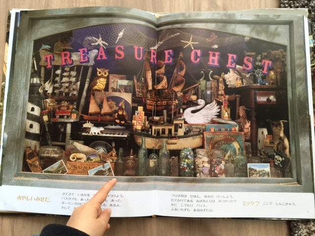 子どもたちの冒険心をくすぐる、宝物がぎっしりつまった箱、海の底に沈んだ難破船など、夢中で物探しをしながらページを進めていくごとに、場面がズームアウトしていきます。