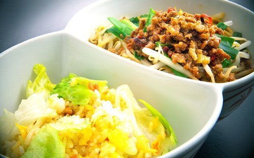 子ども用の椅子や食器もあります。おすすめのランチメニューは「ツイン丼」です。2つの丼が繋がっているお皿に、お好きな飯と麺を各7種類の中から組み合せることができるので、子どもの好みに合わせてオリジナルのランチを作ってシェアできますよ。