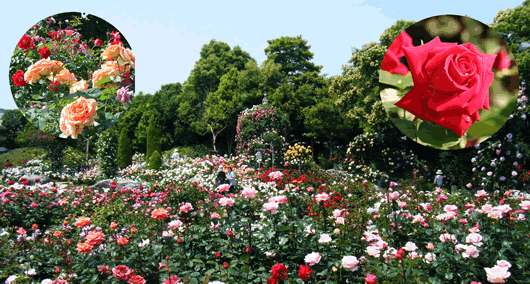 約30万平方メートルの広さを誇る敷地内には、広大な「花ひろば」や「あじさい・しょうぶ園」などの花や緑を楽しむエリア、数多くのレストラン、フラワーショップなどを備えています。