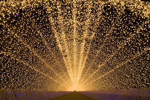 なばなの里のイルミネーションイベントを一躍有名にした「光のトンネル」は、200mも続き圧巻です。近づくと花びらをかたどったかわいらしい白熱電球が、あたたかい光を放っています。遠目にも近目にも楽しめますよ。