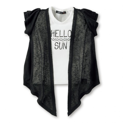 白いTシャツに黒やグレーのジレってとっても大人っぽくてクールな印象ですよね。メガネのだまし絵がプリントされたデザインは、ジレにフリンジが付いていて今年っぽさも倍増です。かわいいといわれるよりもかっこいい!と言われたい女の子にはぜひおすすめです。