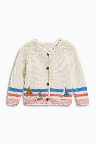 出典:jp.nextdirect.com大き目の目でざっくり編まれたコットン素材のカーディガンです。水色とピンクのボーダーにアップリケのヨットが浮かんだデザイン。