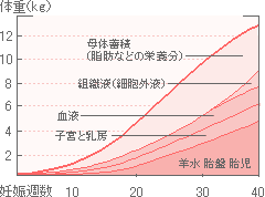 そのほかに、母体に蓄積される、出産とその後の育児(特におっぱい)に備えた脂肪分などの栄養分が約2~4kgです。それ以上の体重増加は皮下脂肪になります。