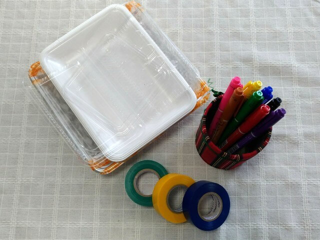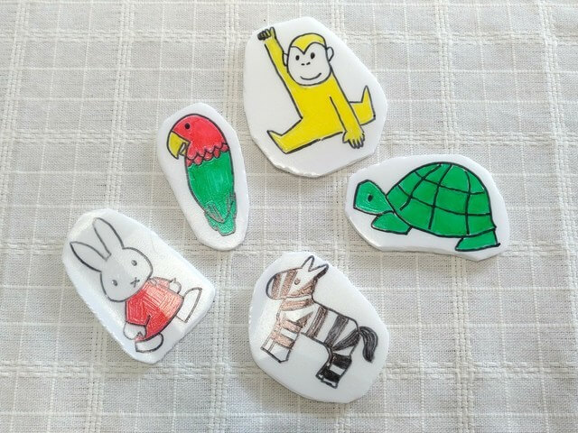 発泡トレイも同じように魚の絵を書いて色を塗り切り取るだけです。魚だけでなくてもスイカやトマトなど、果物や野菜を混ぜてもおもしろいですね。