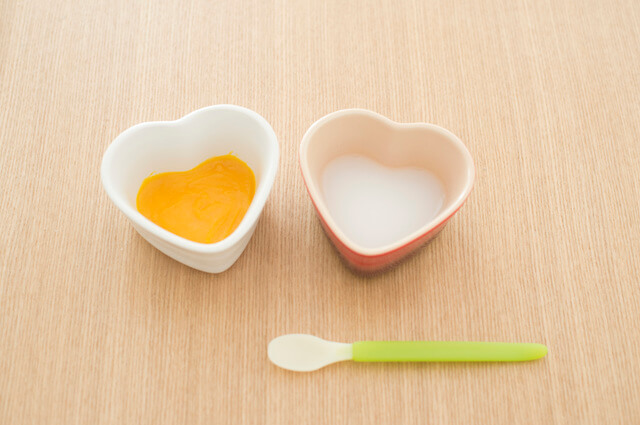 この頃は母乳やミルク以外の物に慣れるための期間なので、離乳食から栄養を摂取できなくても問題ありません。初期の後半には野菜や果物を大さじ1杯分ほど食べさせるようにしましょう。