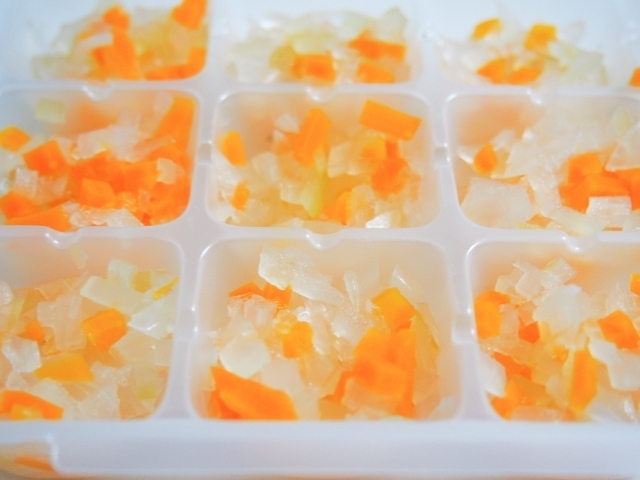 おかゆは冷凍保存することができます。おかゆを作ったら月齢に合わせて量を計り、製氷皿にいれて冷凍保存します。完全に固まったら、ジップロックなどに入れ替えておくと便利です。